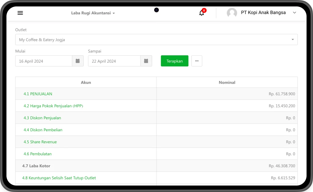 Integrasi POS dan akuntansi restoran. Laporan keuangan lengkap: buku besar, laba rugi & neraca. Siap kapan saja, real-time.