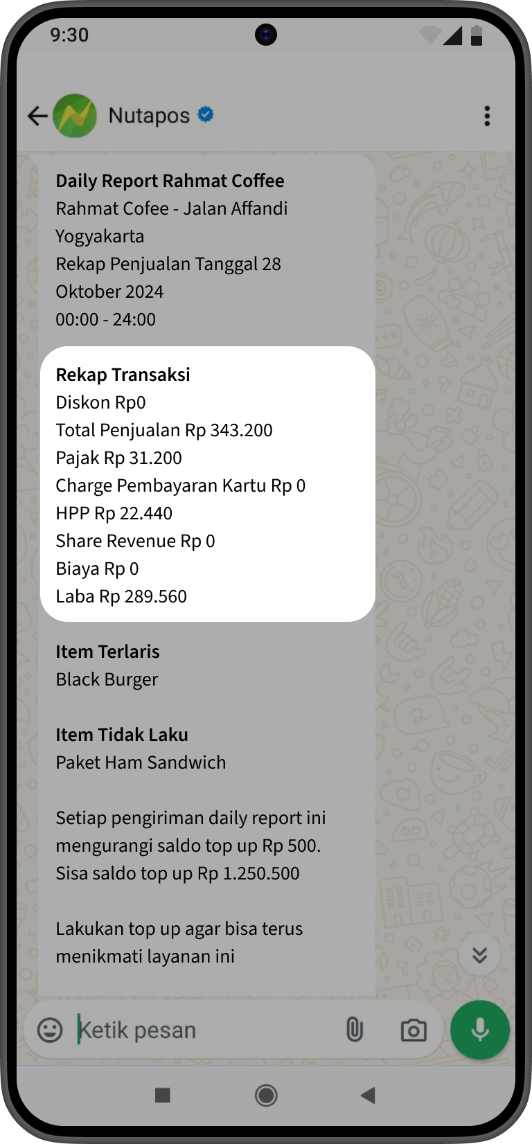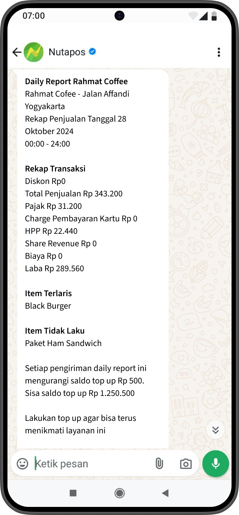 Laporan diterima setiap pagi. Anda cukup buka pesan dari Nutapos dan cek performa bisnis!