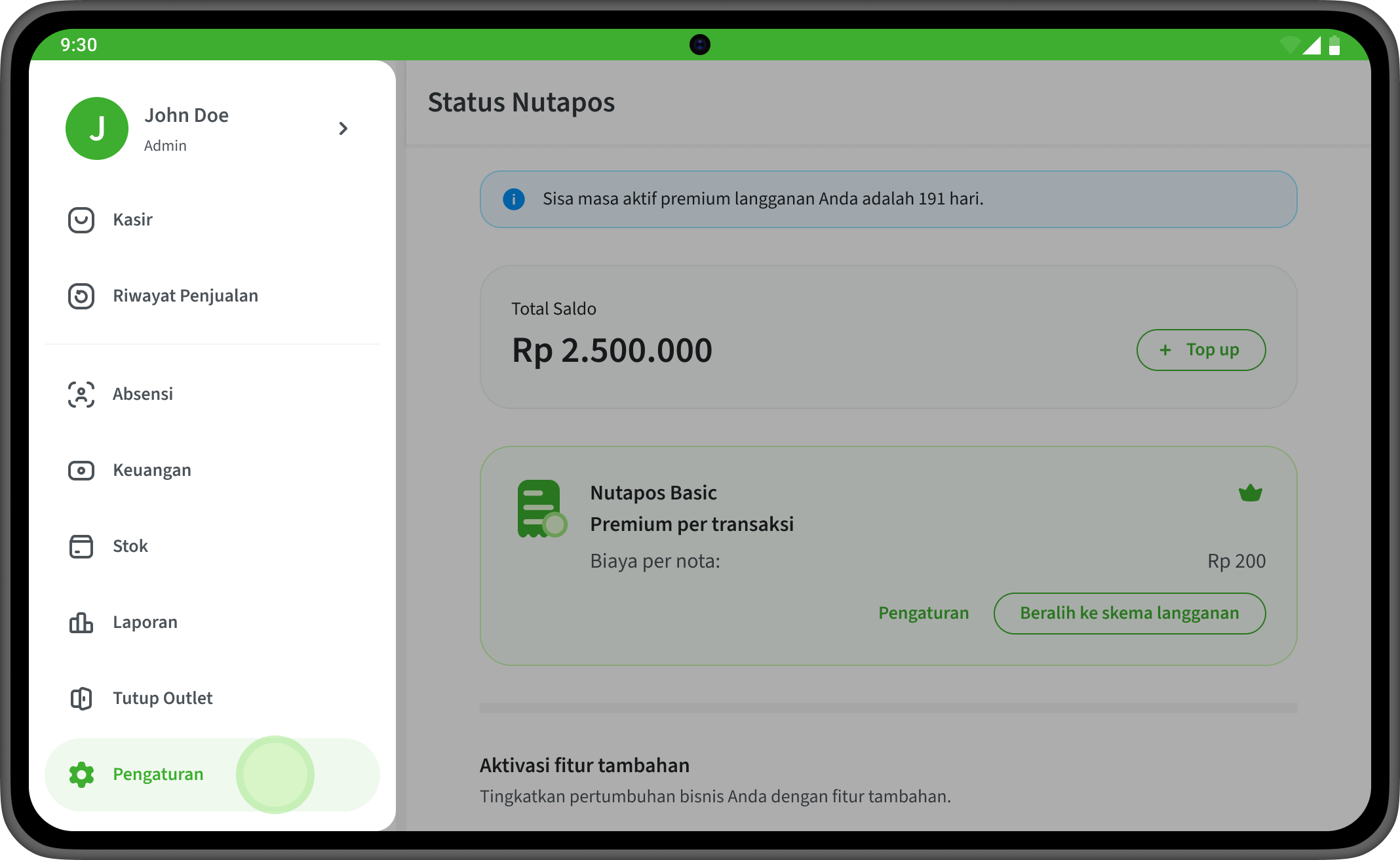 Berikut adalah langkah-langkah untuk mengaktifkan fitur Akuntansi untuk skema berlangganan di aplikasi Nutapos: