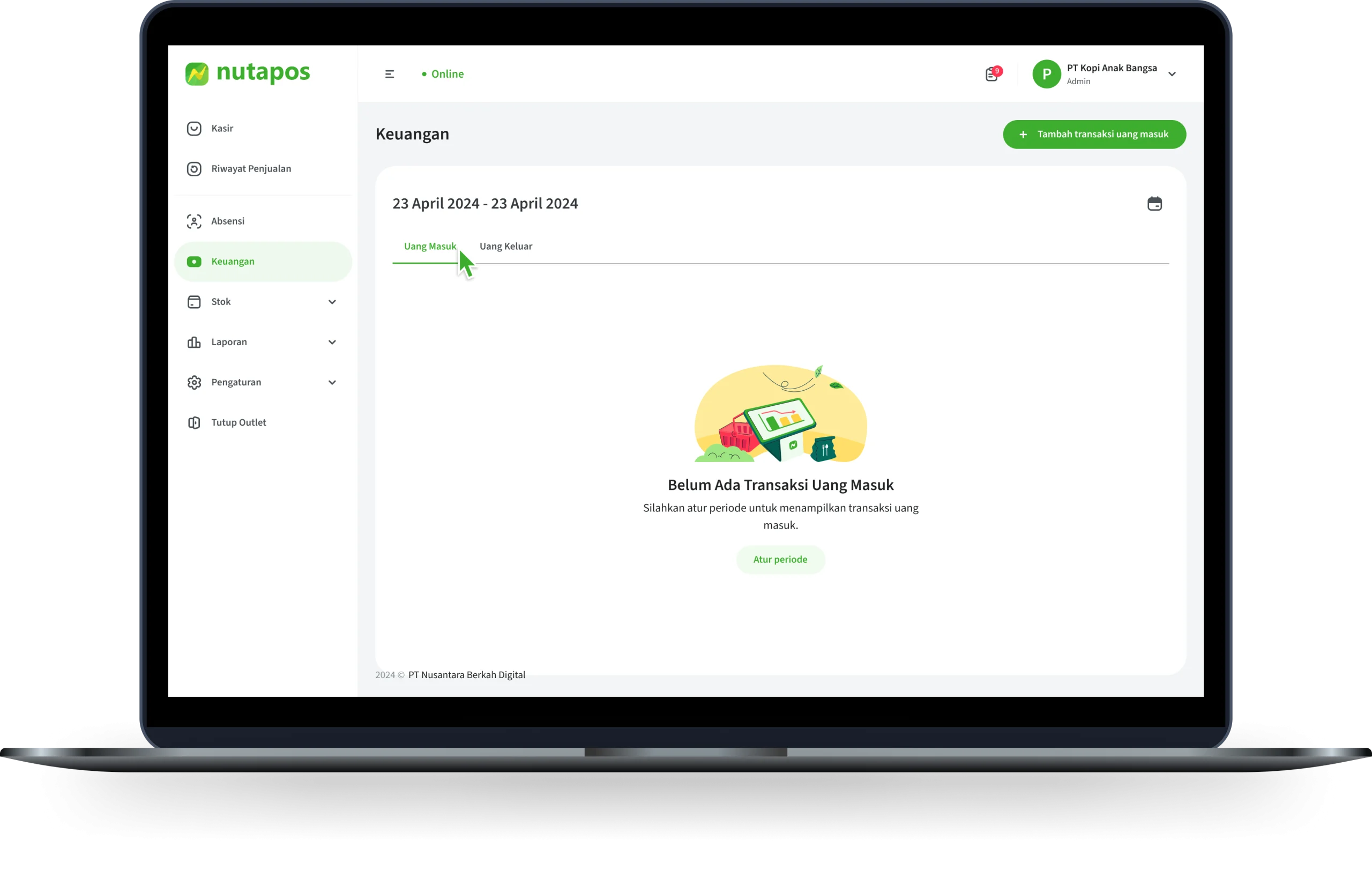 Berikut adalah langkah-langkah untuk menambah uang masuk di aplikasi Nutapos Web: