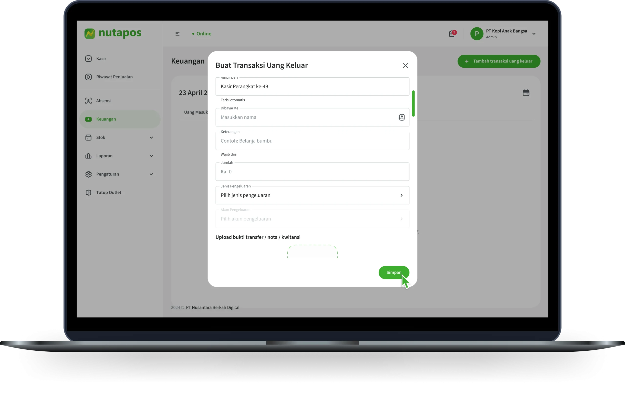 Berikut adalah langkah-langkah untuk menambah uang keluar di aplikasi Nutapos Web: