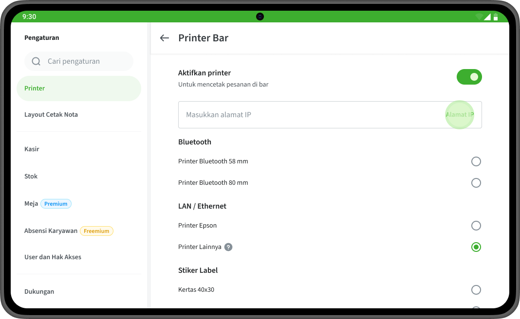 Berikut adalah langkah-langkah untuk menghubungkan printer ethernet/LAN di kasir: