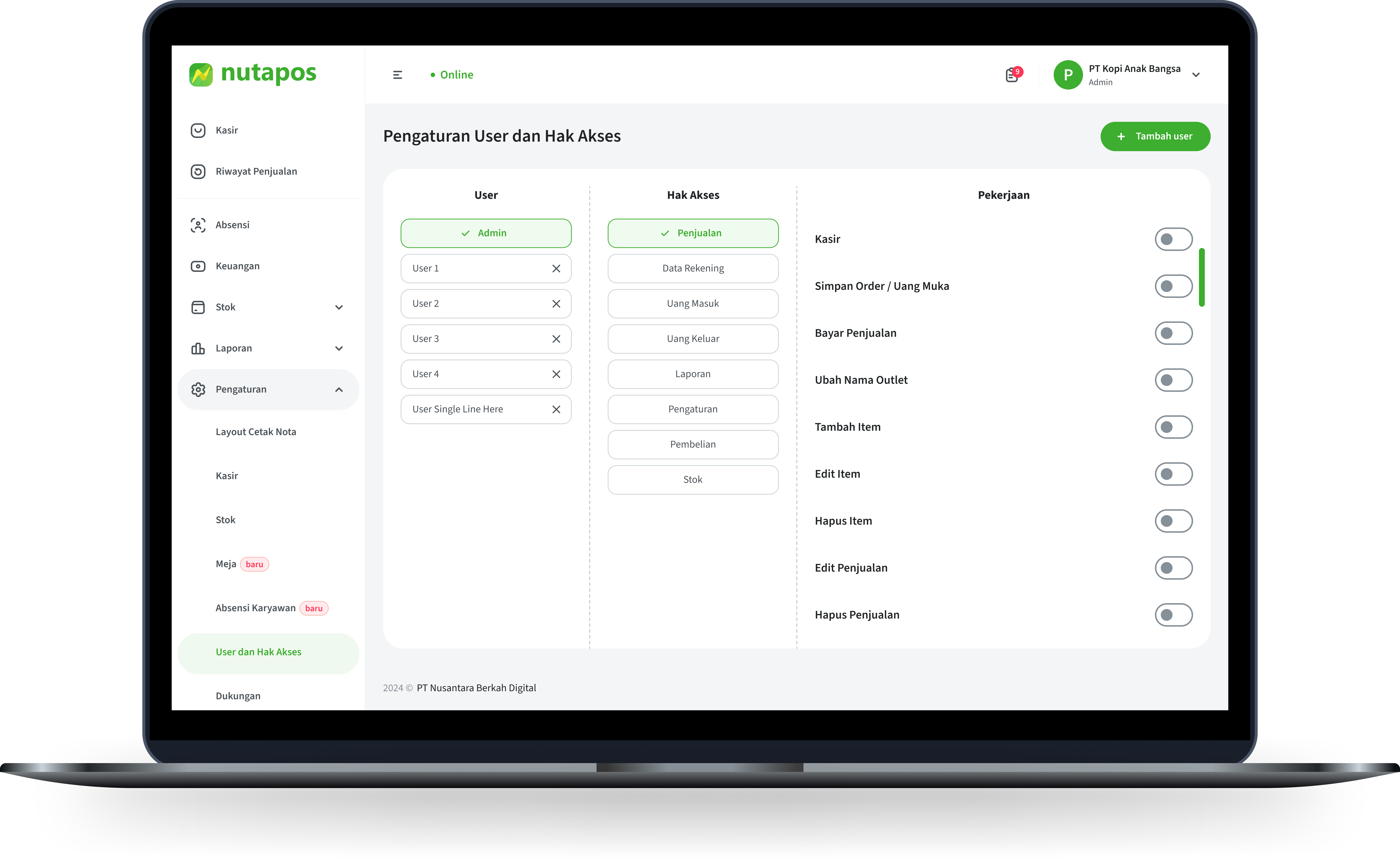 - Bisa atur akses user per outlet (kasir A hanya bisa login di Outlet 1, kasir B di Outlet 2).