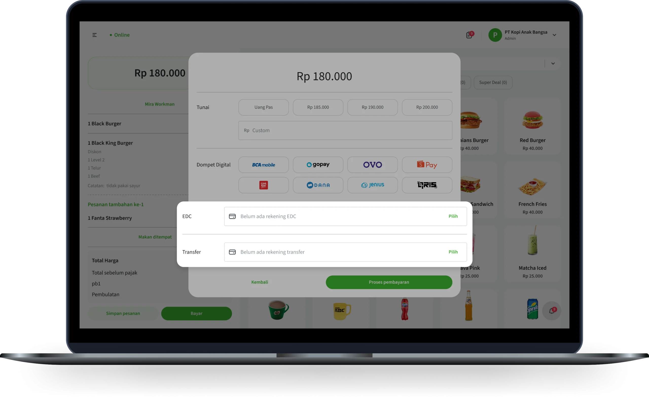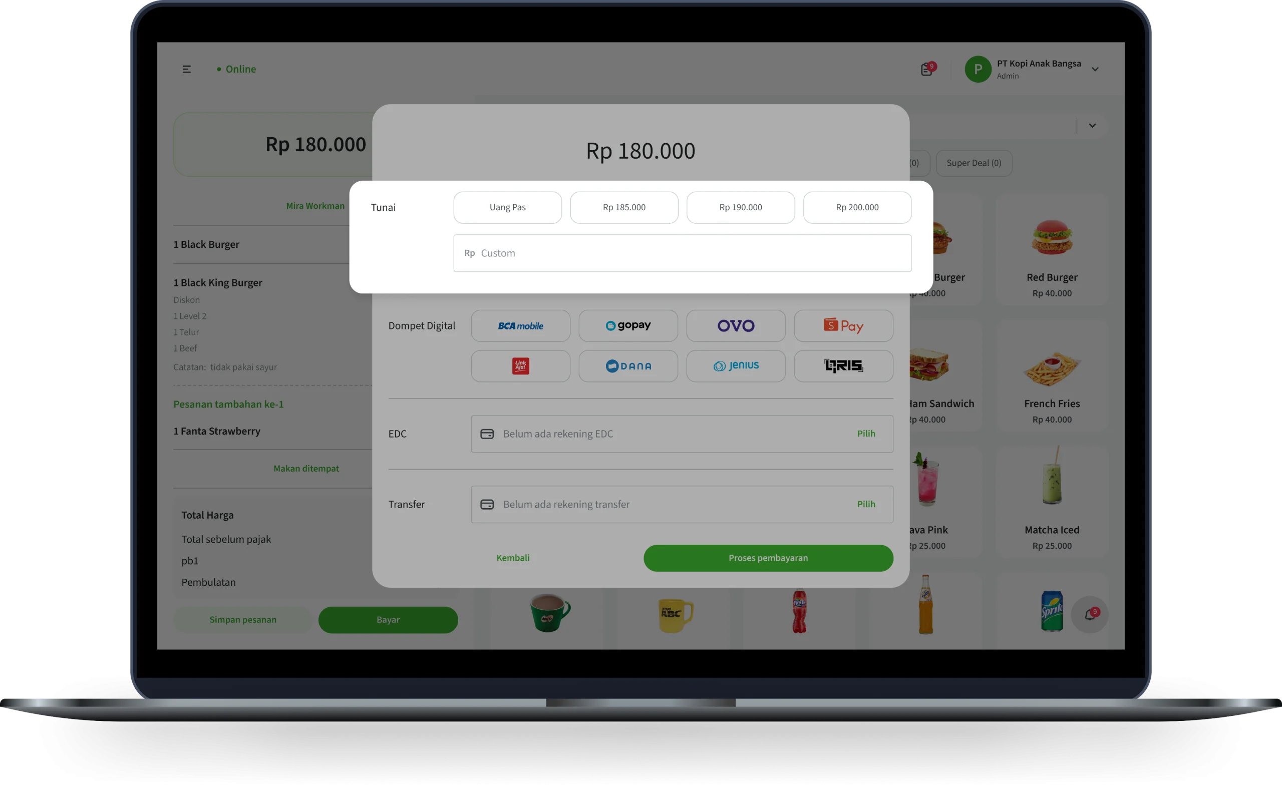 - Dukung banyak metode pembayaran (terima tunai, kartu, QRIS, e‑wallet, dan transfer bank).