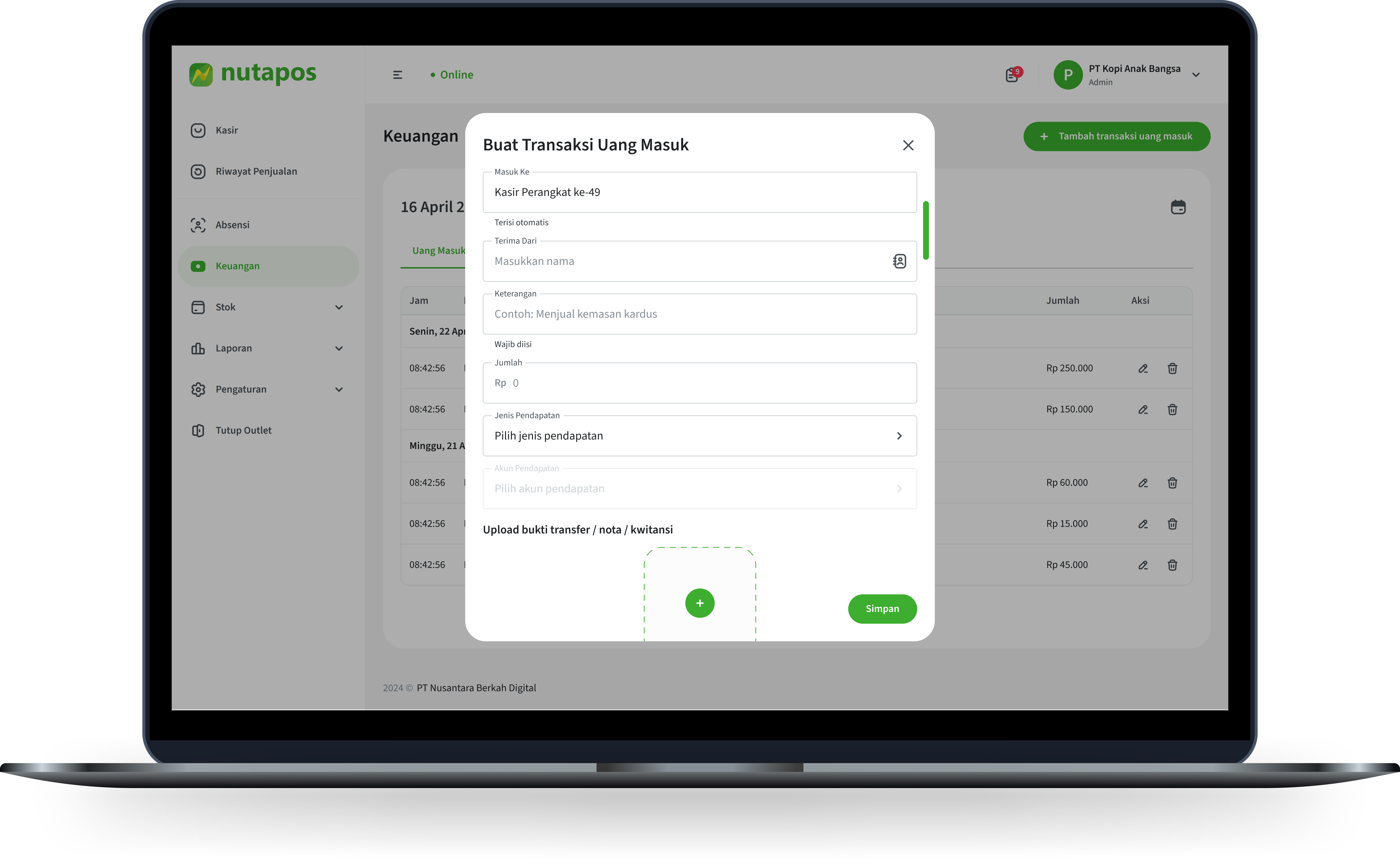 - Isi saldo kas (Catat uang masuk/keluar dari kasir).